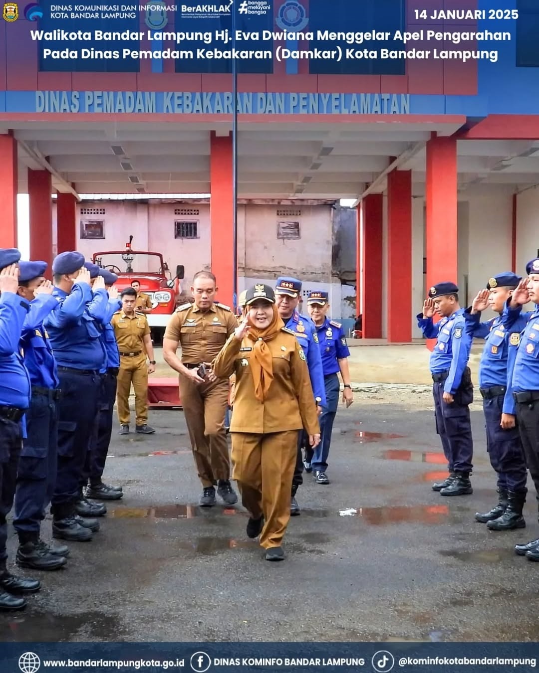 Walikota Bandar Lampung Hj. Eva Dwiana memberikan Pengarahan pada Apel pada jajaran Pegawai Dinas Pemadam Kebakaran (Damkar) Kota Bandar Lampung. Selasa (14/01/2025).
