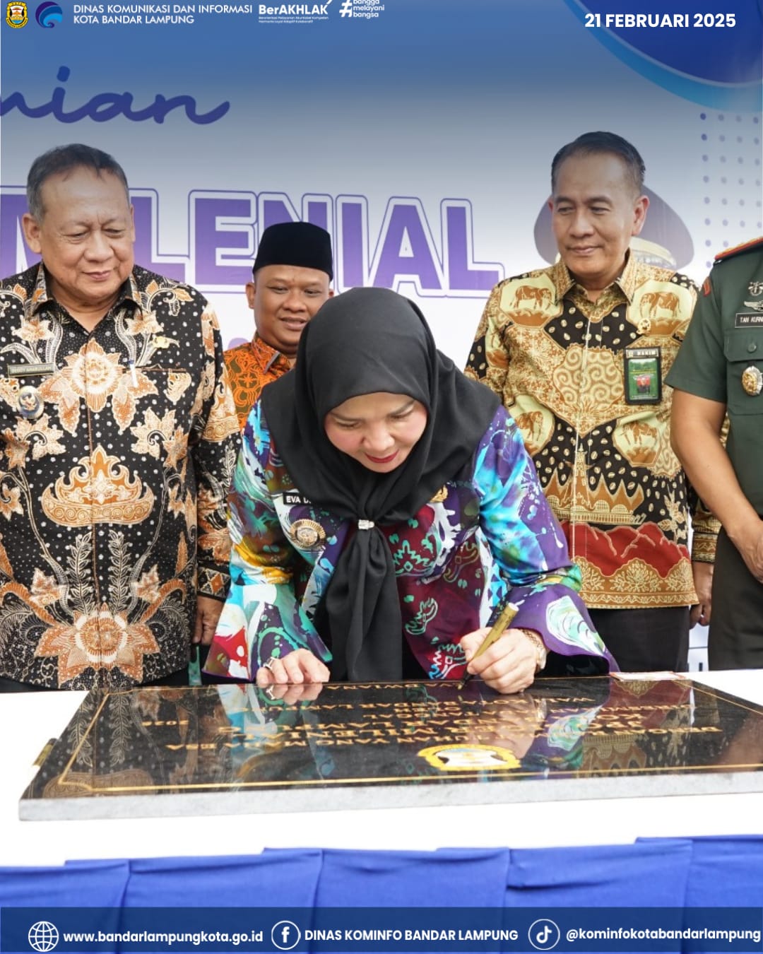 Walikota Bandar Lampung, Hj. Eva Dwiana bersama Wakil Walikota Bandar Lampung Drs. Hi Deddy Amarullah dan Forkopimda Kota Bandar Lampung menekan tombol dan pengguntingan pita tanda diresmikannya JPO Siger Milenial.