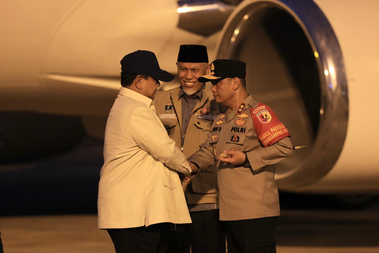 Padang, Mediaberitakota.com- Presiden Republik Indonesia Prabowo Subianto tiba di Bandara International Minangkabau, Kabupaten Padang, Pariaman, Provinsi Sumatra Barat pada pukul 18:30 wib, Rabu (17/12).
